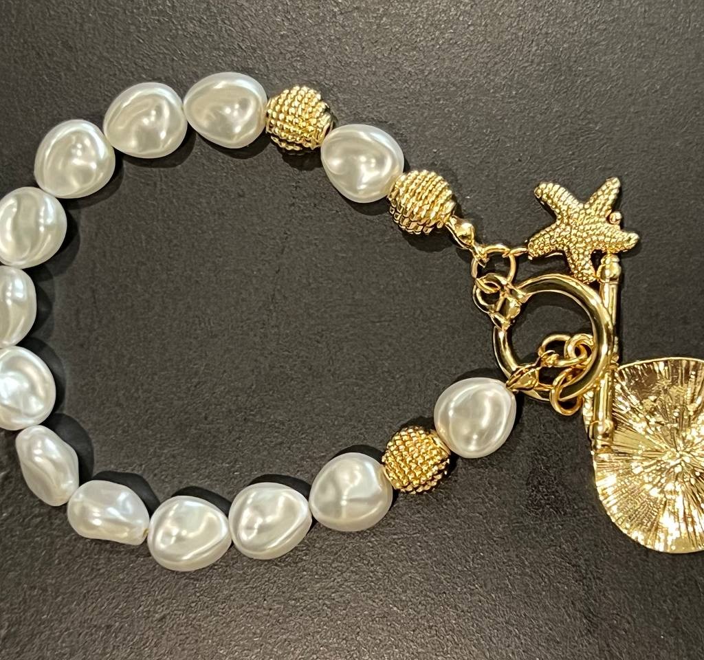 این دستبند با مرواریدهای باروک و مهرههای طلایی، یک اکسسوری خیرهکننده و ساحلی برای استایلهای خاص است