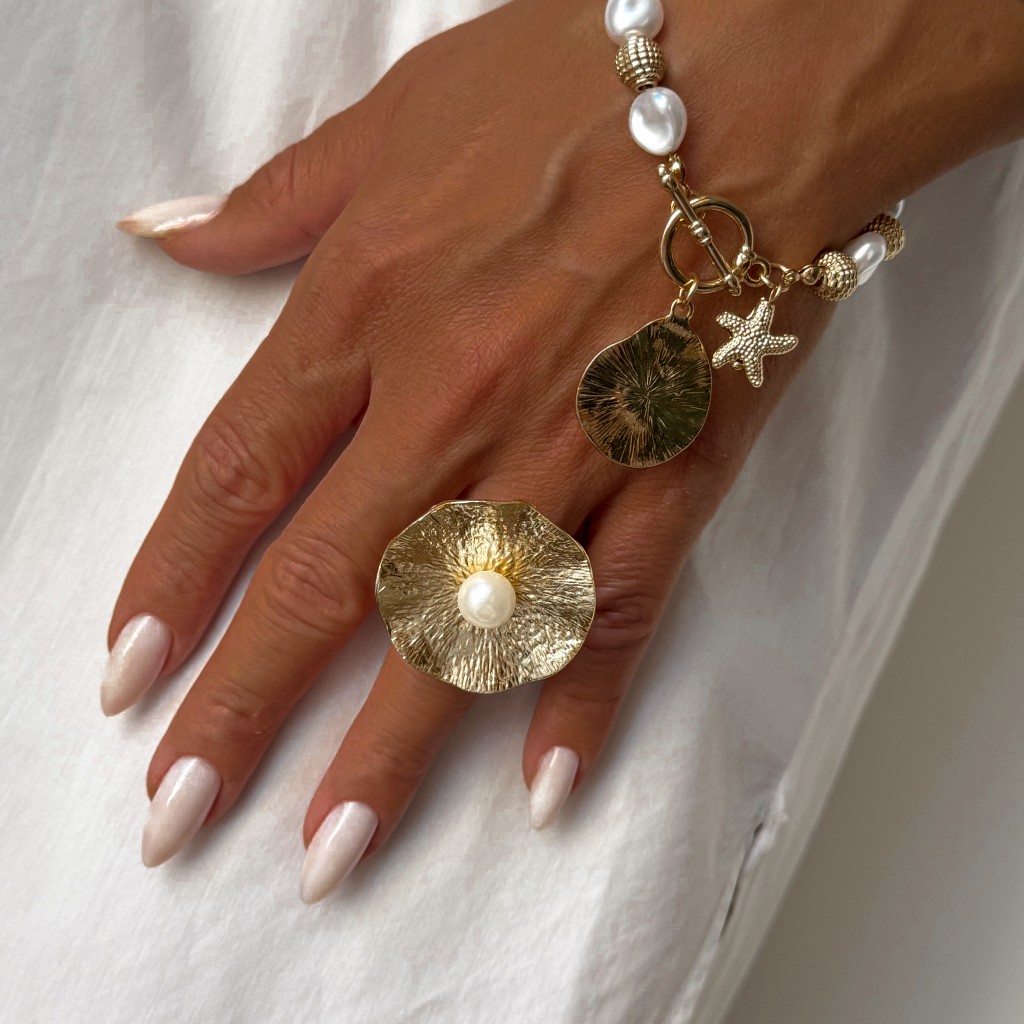 این دستبند با طراحی متفاوت و هنری، از مرواریدهای باروک (مرواریدهای با شکل نامنظم) در کنار مهرههای فلزی طلایی ساخته شده است. این ترکیب، جلوهای لوکس و در عین حال طبیعی به آن بخشیده است. آویزهای طلایی به شکل ستاره دریایی و یک آویز دایرهای با بافت برجسته، زیبایی و خاص بودن این دستبند را دوچندان کردهاند. این دستبند با قفل محکم و قابل تنظیم، برای مجالس و مهمانیها انتخابی ایدهآل است و میتواند به تنهایی جذابیت زیادی به مچ دست شما ببخشد.