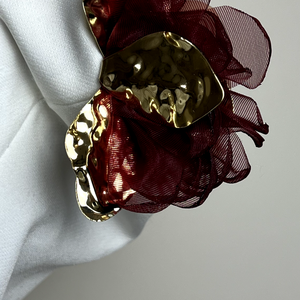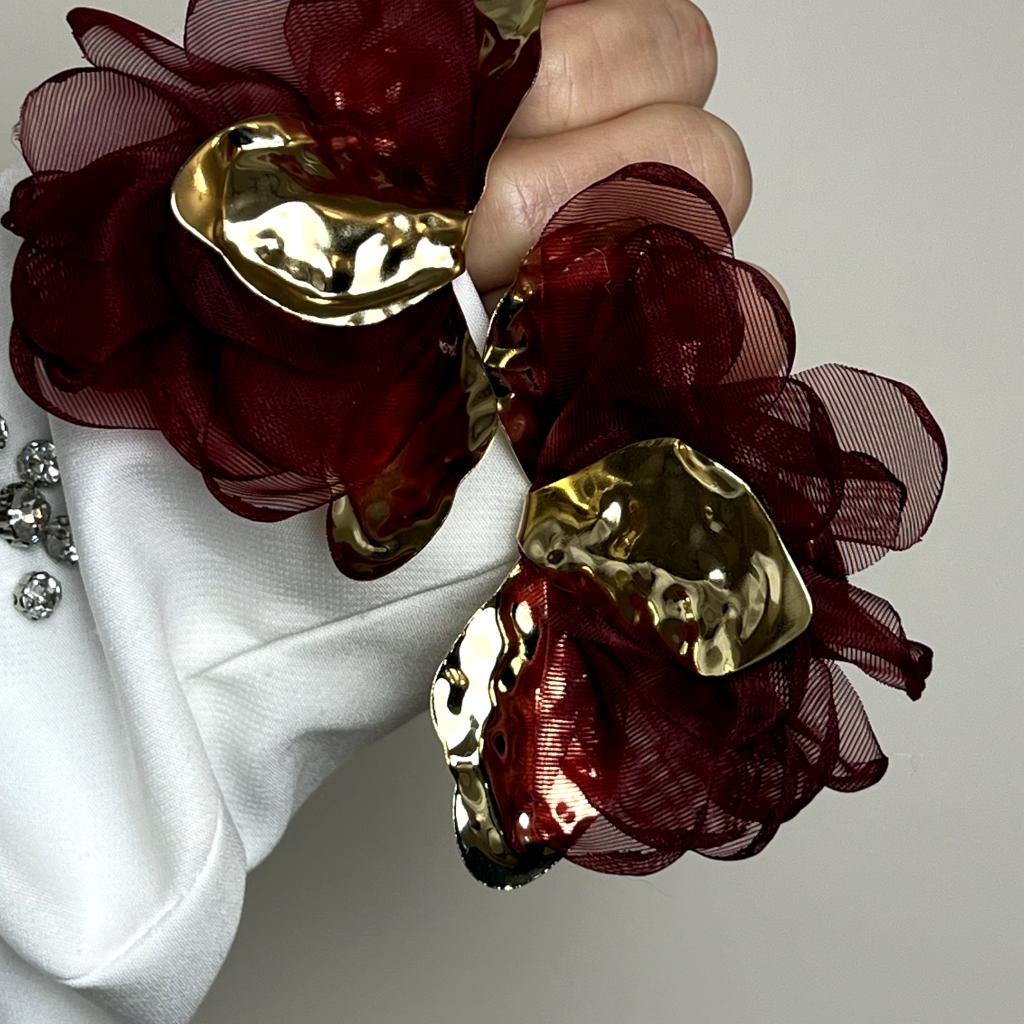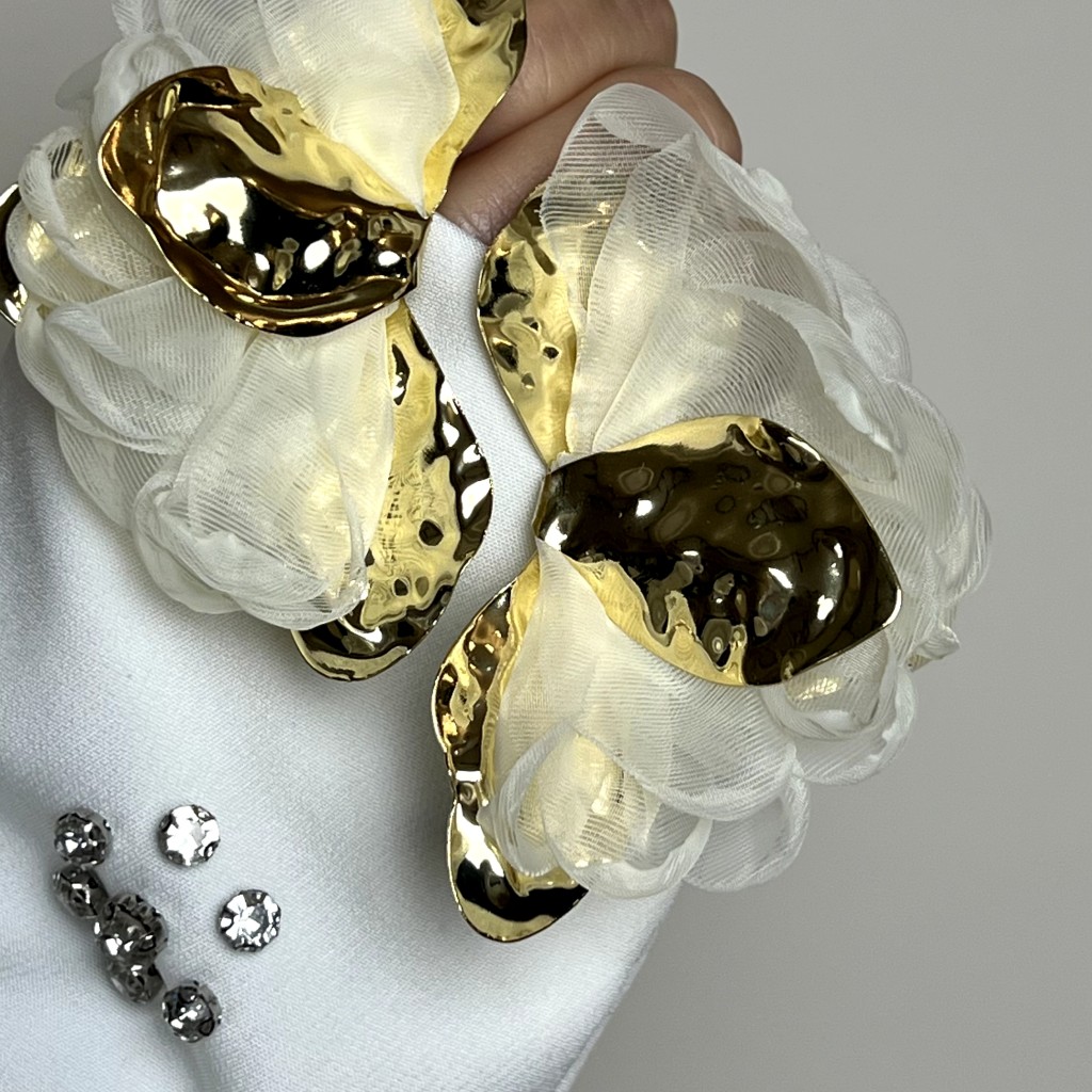 این گوشواره مجلسی با طراحی خاص و ترکیب هوشمندانه پارچه توری لطیف و پلاک فلزی طلایی از جنس ورشو و طرح چکشی، جلوهای لوکس و متفاوت به استایل شما میبخشد. پارچه توری استفادهشده حالتی حجمی و چشمگیر ایجاد میکند، در حالی که فلز طلایی با بافت نامنظم، حس اکسسوریهای خاص و دستساز را القا میکند.
